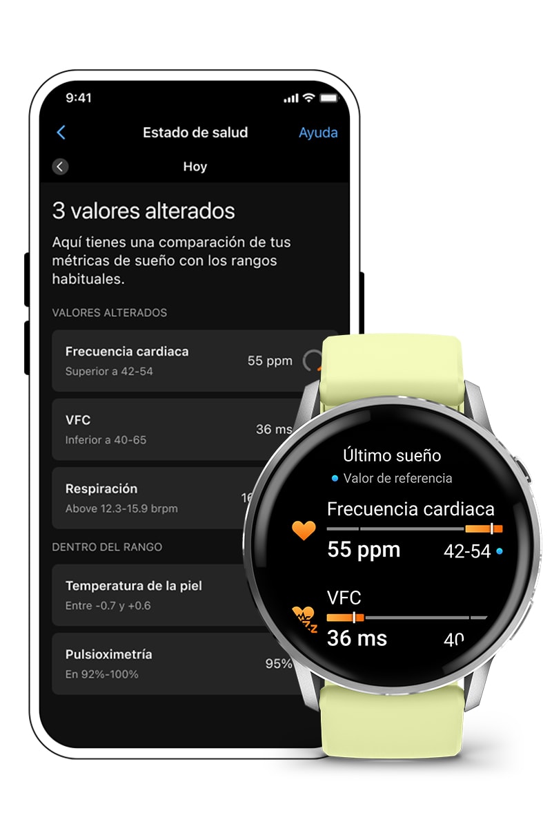 Comprueba si tus métricas de salud, como la frecuencia cardiaca, la VFC, la temperatura de la piel3 y la pulsioximetría1 mientras duermes, se alejan de tu rango habitual, lo que podría indicar un mayor estrés en tu cuerpo. Estos cambios podrían estar relacionados con los niveles de actividad física, el entorno, el estrés, el consumo de alcohol y las posibles enfermedades, entre otros (disponibles en versión beta)4.