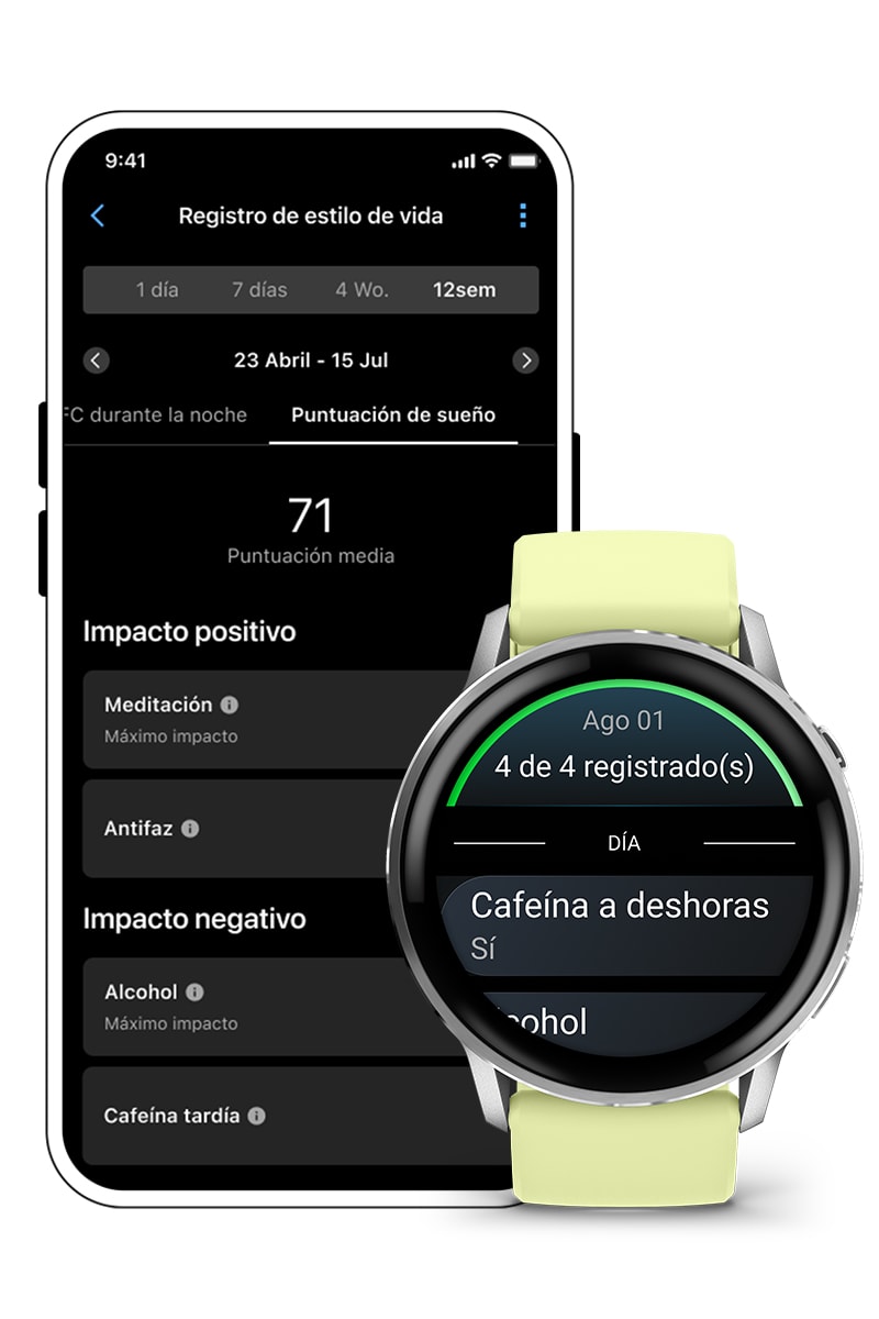 Registra comportamientos personalizados o predefinidos, como la ingesta de cafeína y alcohol, y consulta informes sobre cómo afecta ese estilo de vida al sueño, el estrés y la VFC3 para poder tomar decisiones más saludables.